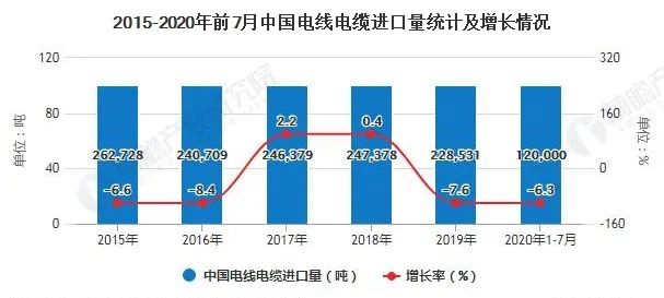 2015-2019年5年間我國(guó)電線電纜進(jìn)口量從26萬(wàn)噸降至23萬(wàn)噸,截止至2020年1-7月進(jìn)口量為12噸,同比下降6.3%,隨著行業(yè)進(jìn)口量的進(jìn)一步下降,電線電纜將迎來(lái)新的發(fā)展。