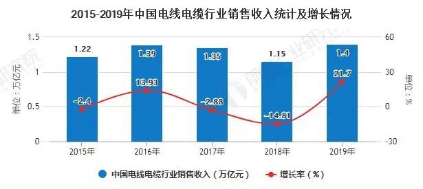 數(shù)據(jù)顯示,2015-2019年我國(guó)電線電纜銷售收入總體呈增長(zhǎng)態(tài)勢(shì),2019年中國(guó)電線電纜行業(yè)銷售收入達(dá)到1.4萬(wàn)億元,同比增長(zhǎng)21.70%。隨著電線電纜行業(yè)規(guī)模將不斷增加,電線電纜市場(chǎng)發(fā)展前景廣闊。
